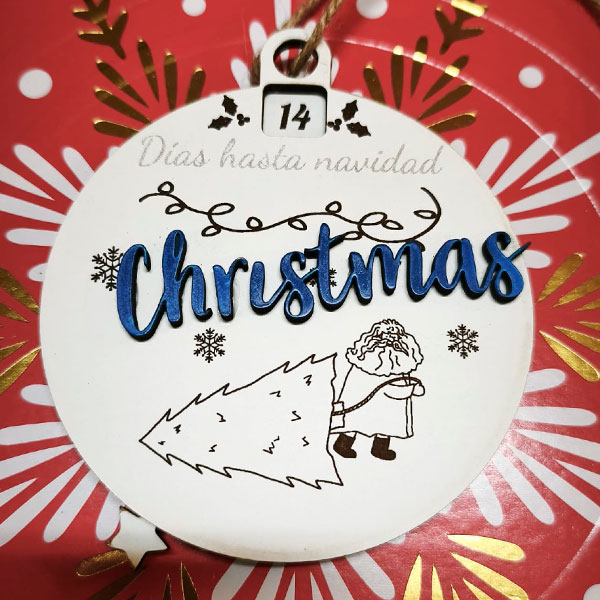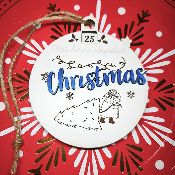 Bonita bola de navidad en tablero MDF blanco, con selector de cuenta atrás para la navidad. La palabra Christmas se puede cambiar. Incluye cuerda para colgar.