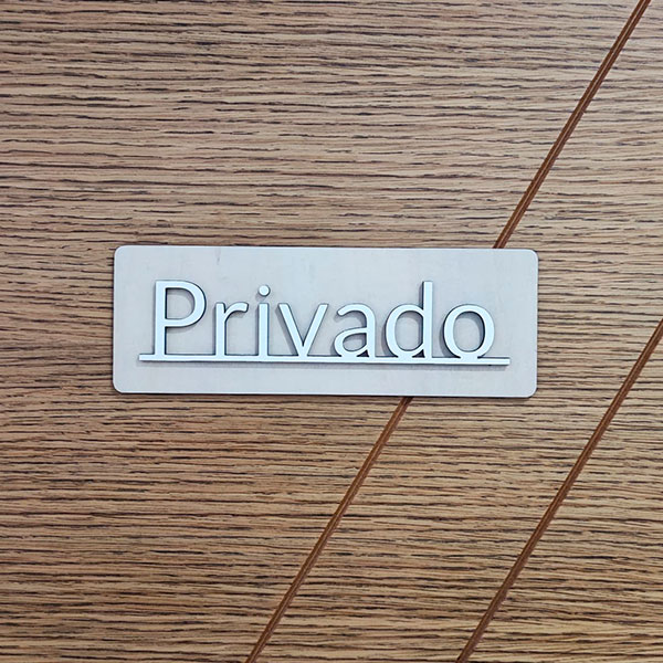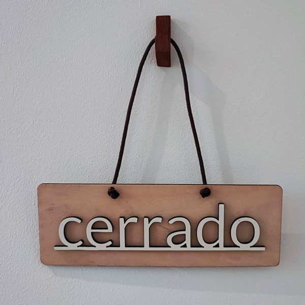 Cartel en madera natural con letras superpuestas en MDF pintado.