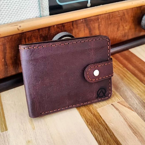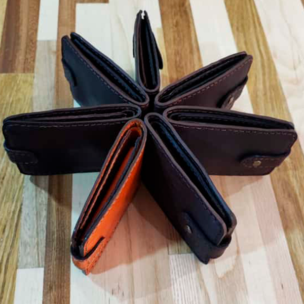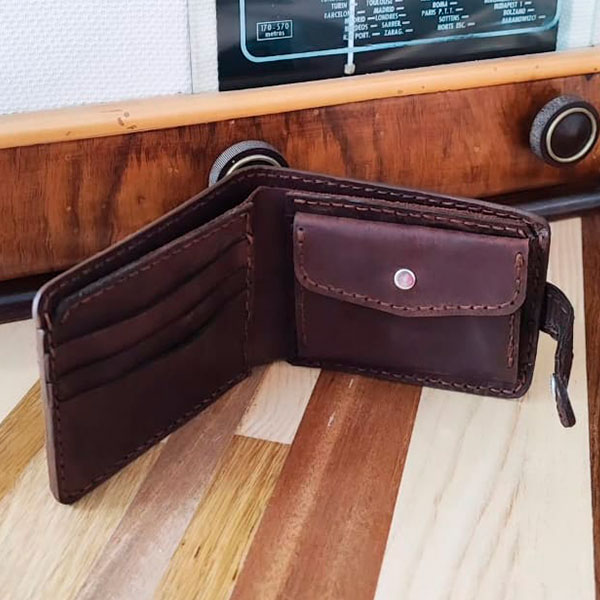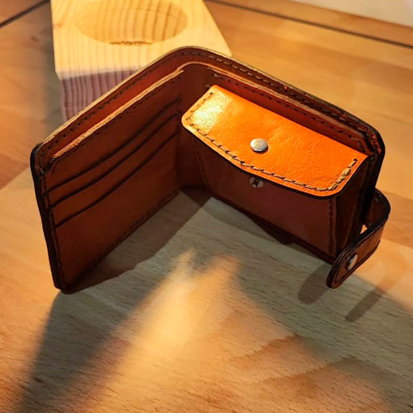 Cartera artesanal 100% cuero vacuno o ciervo. Múltiples huecos para tarjetas, billetera y monedero con cierre. Personalizable con iniciales en el interior.