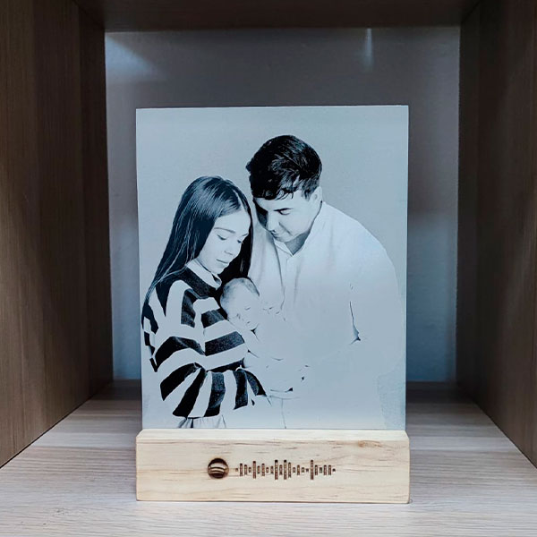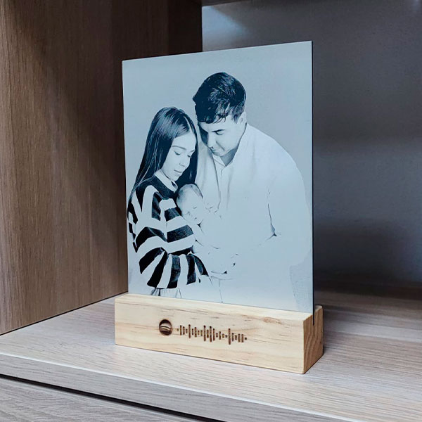 Personalizable con foto o logo en la plancha, y con frase o código Spotify en la base.
