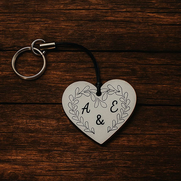 Llavero en tablero MDF chapado en blanco con forma de corazón, personalizado con iniciales grabadas a láser.