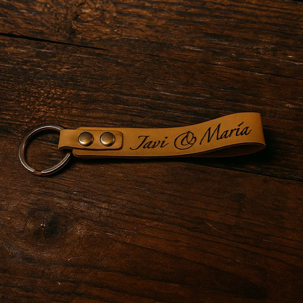 Llavero en cuero personalizado con frase o nombres grabados a láser.