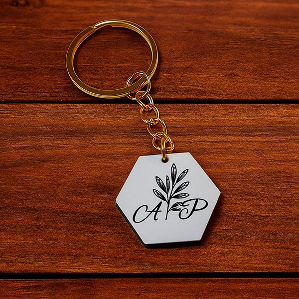 Llavero en tablero MDF chapado en blanco, personalizado con iniciales grabadas a láser.